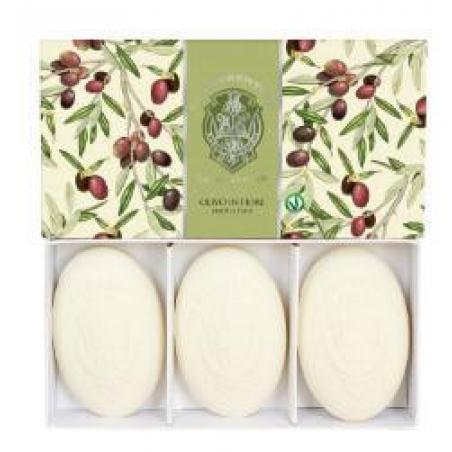 3 Saponi solidi scolpiti all'Olivo in Fiore, con burro di Karitè e Olio d'Oliva.