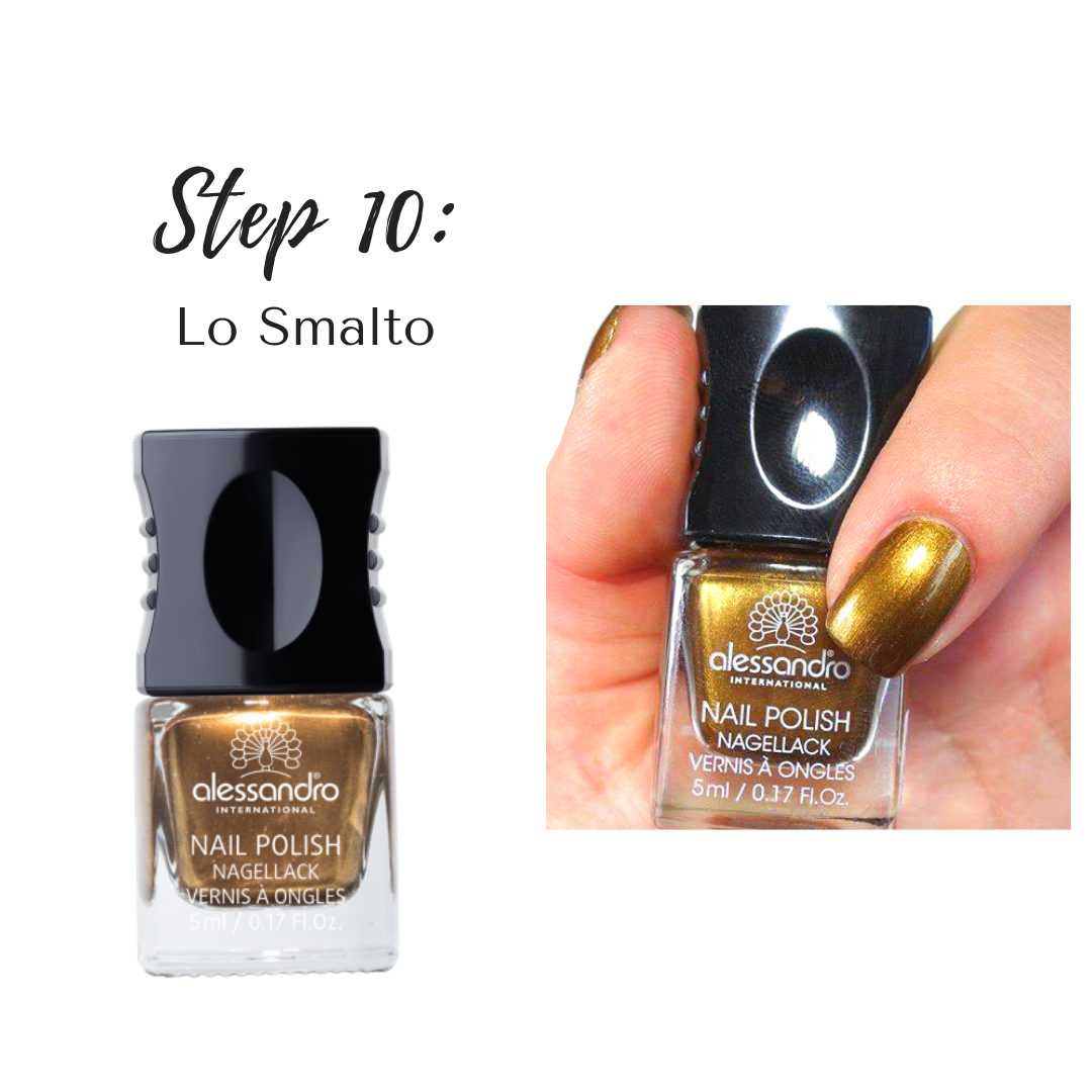 Ogni make up che si rispetti termina con un passaggio alla manicure! Per chiudere in bellezza ho scelto una tonalità dorata che non ti farà di certo passare inosservata: Brilliant Amber di Alessandro International. Il tocco finale che completa questo look dai riflessi del sole!