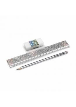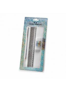 Set ideale per la scuola o il tempo libero, composto da un righello con applicazione strass all-over, una gomma trasparente glitter con fascetta olografica e una matita effetto cangiante con dettaglio diamond.