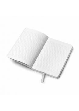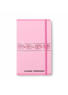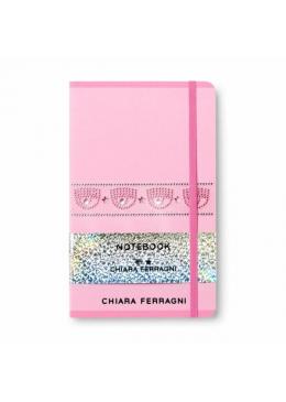 Notebook formato 13 x 21 cm con cover rosa soft touch, logomania in strass applicati e comodo elastico di chiusura.