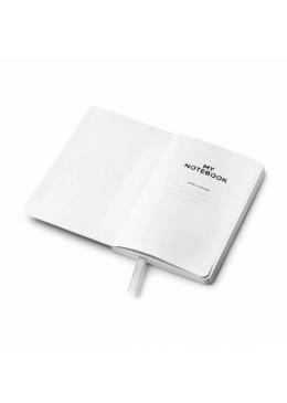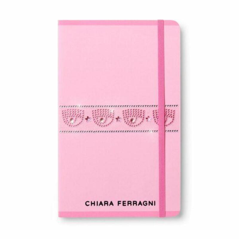 Notebook formato 13 x 21 cm con cover rosa soft touch, logomania in strass applicati e comodo elastico di chiusura.