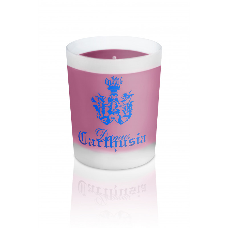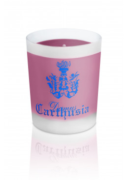 Un bicchiere sabbiato con inciso il logo Carthusia racchiude al suo interno una candela profumatissima alla fragranza Frutto di Bacco, ideale per profumare ogni angolo della casa.