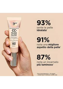 Ottieni una pelle immediatamente più luminosa e idratata con CC+ Nude Glow SPF 40, un fondotinta a media copertura con una finitura luminosa. Con il 90% di prodotti per la cura della pelle, la nostra formula contiene un siero illuminante con il 2% di Niacinamide, acido ialuronico, estratto di tè verde e SPF 40. In sole 4 settimane, questa base per il trucco clinicamente testata* risolve i principali problemi della pelle migliorando visibilmente luminosità, consistenza e levigatezza, contribuendo anche a uniformare il tono della pelle. Inoltre, fornisce idratazione 24 ore su 24 per un bagliore sano istantaneo e un look senza trucco ma truccato. Sviluppato con chirurghi plastici e dermatologi, IT Cosmetics crea soluzioni reali per problemi reali, con formule skin-friendly che forniscono risultati visibili.