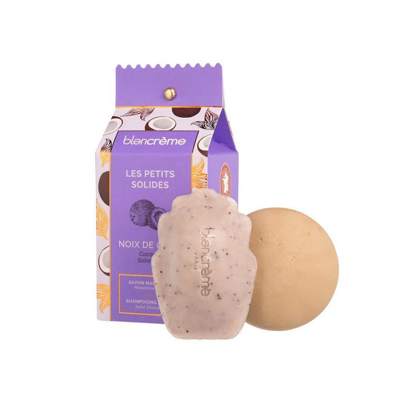 Trovate in questo adorabile berlingot 2 prodotti solidi per la cura: – Il nostro sapone madeleine esfoliante al profumo esotico di Cocco: un sapone dalle linee gourmet che contiene il 97% di ingredienti di origine naturale. La sua formula arricchita con gusci di cocco rimuove le impurità dalla pelle e la lascia morbida e leggermente profumata – Uno shampoo solido per tutti i tipi di capelli con olio di lino e mandorle dolciUna cura dei dettagli a basso prezzo da offrire senza moderazione a tutti gli appassionati di cure solide! Ideale per tutti i tipi di pelle e capelli