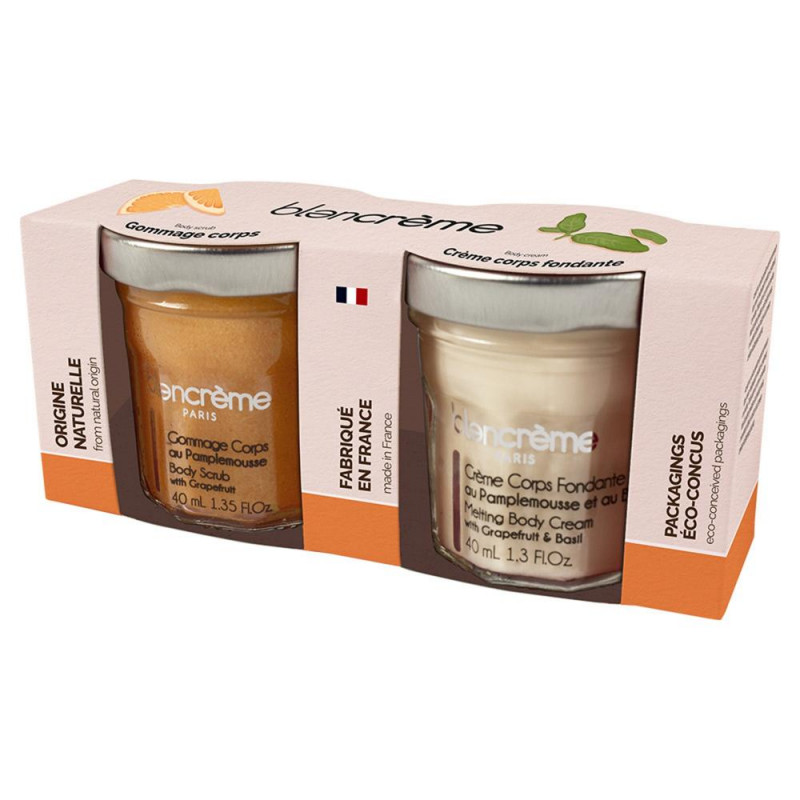 Il duo perfetto per scoprire i nostri trattamenti corpo al pompelmo e basilico: uno scrub corpo e una crema corpo in formato da viaggio 40 ml. Lo scrub al granito, con polvere di buccia di pompelmo e olio essenziale di basilico, esfolia e affina la grana della pelle. La crema corpo, arricchita con estratto di pompelmo e olio essenziale di basilico, idrata e nutre. La pelle è morbida e fresca.