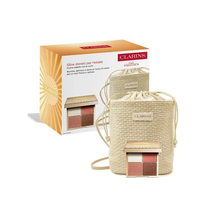 La palette perfetta per creare look solari e brillare tutta l’estate, con un’esplosione di luce e colori per viso e occhi! Contiene quattro polveri perlate con pigmenti di origine naturale, dalla texture morbida e cremosa, facile da applicare con le dita o un pennello. Grazie alla sua formula ultraperlescente, illumina e scolpisce con un solo tocco, garantendo una tenuta fino a 12 ore. Puoi scolpire l’incarnato per esaltare l’abbronzatura, intensificare lo sguardo con un tocco iridescente o creare un make-up radioso e unico. I colori inclusi nella palette sono: Bianco perlato, Oro rosa, Rosa intenso e Marrone cioccolato. Si fondono perfettamente con la pelle per un risultato impeccabile e luminoso. In più, il kit contiene l'esclusiva borsa a secchiello firmata Clarins! Edizione limitata