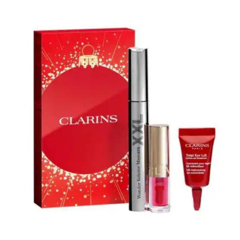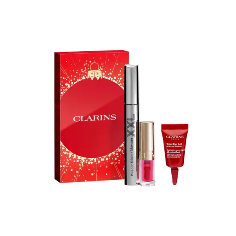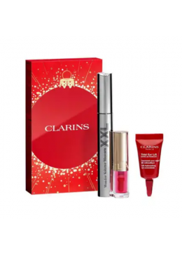 Clarins - Cofanetto Mascara XXL Eyes è un set completo per valorizzare lo sguardo e le labbra, unendo volume estremo, luminosità e trattamento. Una routine di bellezza che esalta lo sguardo e dona comfort alle labbra in un solo cofanetto. Wonder Volume XXL Mascara – 01 Black (Full Size) Mascara volumizzante ad effetto intenso e definito. La formula arricchita con Volumizing Wax Complex a base di cera di girasole, jojoba e acacia nera amplifica il volume e la densità delle ciglia, mentre il Lash Boosting Complex le aiuta a diventare naturalmente più forti e lunghe nel tempo. L’applicatore in fibre di ricino distribuisce il prodotto in modo uniforme, regalando uno sguardo aperto e magnetico con 12 ore di tenuta. Lip Comfort Oil – 04 (Mini Size) Olio labbra nutriente e illuminante con il 93% di ingredienti di origine naturale, tra cui olio di jojoba, nocciola e rosa canina biologica. Idrata, protegge e sublima le labbra con un finish lucido e naturale. La texture leggera e non appiccicosa dona comfort immediato e un effetto rimpolpato. New Total Eye Lift – 3 ml (Sample) Trattamento concentrato effetto lift e rimpolpante per il contorno occhi. Grazie alla tecnologia simile al retinolo con estratto di harungana e al Matrix Pro-Tensoriale, riduce le rughe, solleva le palpebre e illumina lo sguardo. La texture leggera e setosa si assorbe rapidamente, regalando uno sguardo più giovane e disteso. Benefici: Volume estremo e definizione delle ciglia. Labbra morbide, idratate e luminose. Contorno occhi liftato e sguardo visibilmente più aperto. Contenuto del cofanetto: Wonder Volume XXL 01 (Full Size) Lip Comfort Oil 04 (Mini) New Total Eye Lift (Sample 3 ml)
