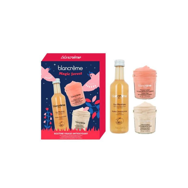 Una routine viso antiossidante per una pelle protetta e luminosa. L'acqua micellare (99,1% di origine naturale) con estratti di limone, pompelmo e arancia rimuove delicatamente il trucco. Il doppio sorbetto esfoliante (96,3% di origine naturale) è un doppio scrub enzimatico e meccanico con acidi della frutta e scorze di limone e arancia. Elimina le impurità e leviga la pelle. La maschera sorbetto antiossidante (94,4% di origine naturale) con olio di mirtillo rosso, polpa e olio di melograno, ceramidi di grano e acido ialuronico lascia la pelle elastica e luminosa.