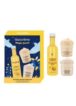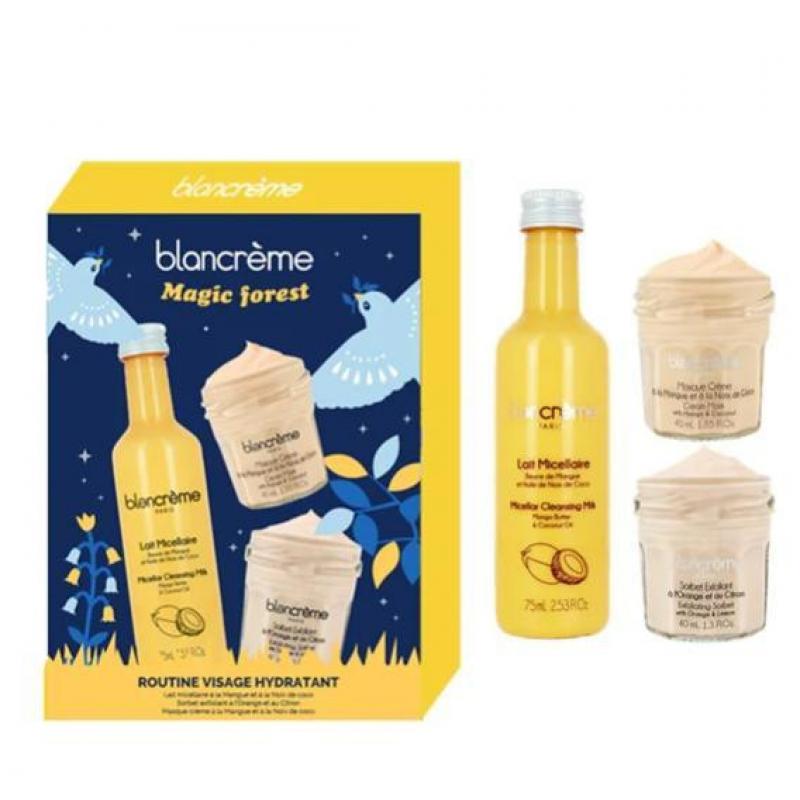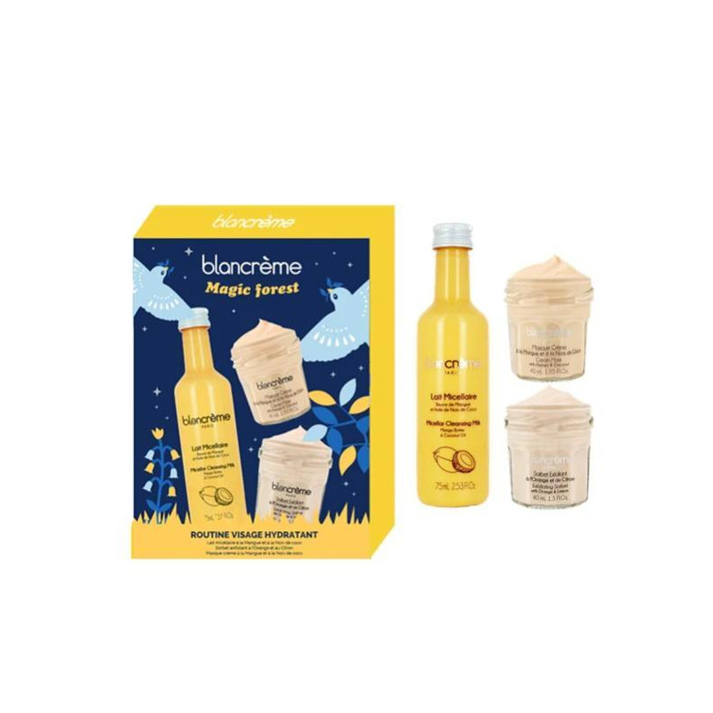 Una routine viso idratante per una pelle nutrita e lenita. Il latte micellare (97,9% di origine naturale) con burro di mango, olio di cocco e allantoina rimuove delicatamente il trucco. Il doppio sorbetto esfoliante (96,3% di origine naturale) è un doppio scrub enzimatico e meccanico con acidi della frutta, scorza di limone e arancia. Elimina le impurità e leviga la pelle. La maschera in crema (98,6% di origine naturale) con burri di mango e di karité e olio di cocco idrata, nutre e lenisce la pelle con una sensazione di comfort.