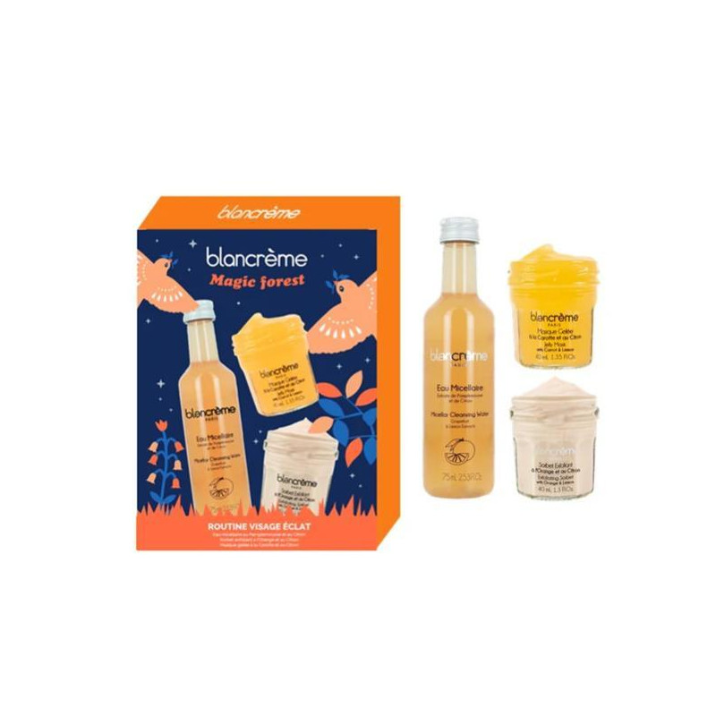 Una routine viso radiosa per una pelle luminosa e un colorito uniforme. L'acqua micellare (99,1% di origine naturale) con estratti di limone, pompelmo e arancia rimuove delicatamente il trucco. Il doppio sorbetto esfoliante (96,3% di origine naturale) è un doppio scrub enzimatico e meccanico con acidi della frutta e scorze di limone e arancia. Elimina le impurità e leviga la pelle. La maschera in gel (96% di origine naturale) con estratto di limone biologico, macerato oleoso di carota biologico, vitamina C e alfa arbutina fornisce un vero e proprio boost di luminosità, lasciando la pelle più luminosa, morbida e con un colorito uniforme.