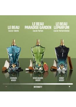 Vestito semplicemente di una foglia ricamata, Le Beau Paradise Garden coltiva il suo potere seduttivo. La sua raffinata fragranza smeraldo cattura con grazia la sua sensualità in tutta la sua complessità. Al contempo solare e speziato, risveglia il desiderio fino all'ossessione. La scoperta ha inizio, il viaggio si preannuncia accattivante. Una fragranza legnosa, verde e acquatica (creata da Quentin Bisch). Questo profumo celestiale è un raggio di sole tropicale, con i suoi fiori scintillanti e le essenze seducenti, tutti raccolti dal Giardino di Gaultier. Il cocco fresco e salato si mescola con il fico verde e il sandalo sensuale. Zenzero speziato, menta rinvigorente e fava tonka baciata dal sole: le note verdi, acquatiche e legnose di questa fragranza sono appassionate come gli uomini virili che la indossano.