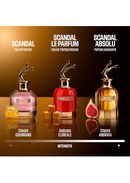 Uno Scandalo assoluto! A infiammare le notti parigine di Jean Paul Gaultier c’è un nuovo scandalo: Scandal Absolu. Sulla pista, le sue gambe nude sfiorano l’indecenza. L’oro laccato brilla di una sensualità senza ritegno. La fragranza chypre ambrata intensa inebria i sensi. Un invito ad accogliere l'eccentricità e a divertirsi fino alle ultime note di festa. Un’audacia irresistibile! Un flacone dorato e irriverente. Una dorata brillantezza e gambe nude arricchite dal vetro sfaccettato e laccato come un gioiello: questo prezioso flacone affascina i sensi fino allo scandalo. In un irresistibile gioco di specchi e di trasparenze, la sfumatura luminosa si permette ogni audacia. La notte è sua, la seduzione è assoluta.