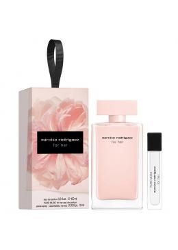 Questo cofanetto include: for her Eau de Parfum 100 ml + for her PURE MUSC Eau de Parfum 10ml In for her eau de parfum la femminilità della rosa e la dolcezza della pesca avvolgono con estrema delicatezza il misterioso cuore di muschio, l'iconica firma olfattiva di Narciso Rodriguez. La donna che indossa questa fragranza è sofisticata, si distingue per la sua femminilità misteriosa. Un profumo femminile avvolgente, dalla scia sensuale.