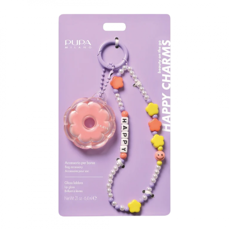 Pupa Happy Charms Lip Gloss Happy Lilla è un prodotto make-up che unisce la dolcezza di un gloss alla giocosa originalità di un charm. Il lip gloss presenta una texture brillante e confortevole con una fragranza vanigliata, arricchito da perline colorate e lettere che compongono charm da agganciare a borse, zaini o jeans. È dermatologicamente testato e progettato per donare alle labbra un aspetto luminoso e leggermente tonalizzato. Può essere applicato da solo su tutta la superficie labiale per un effetto glossy deciso, oppure usato come tocco centrale sopra il rossetto per creare un effetto volume 3D.
