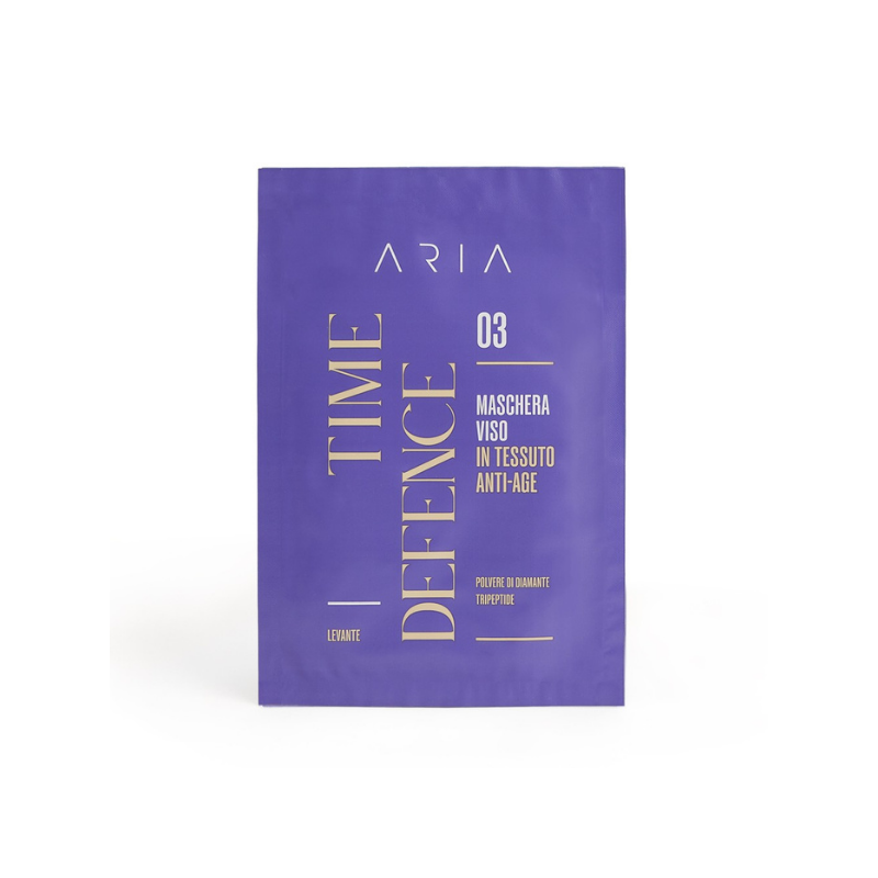 Aria Time Defence è un trattamento d’eccellenza per il viso progettato per contrastare efficacemente i segni del tempo e donare un aspetto più levigato e luminoso. La sua formula esclusiva al “diamante & oro” combina polvere di diamante, nota per le proprietà antiossidanti e rivitalizzanti, e oro colloidale, che contribuisce a migliorare l’elasticità cutanea e ridurre visibilmente le rughe. I peptidi biomimetici SH-Pentapeptide-35 stimolano la produzione di collagene, mentre l’acido ialuronico a triplo peso molecolare idrata in profondità. Il risultato è una pelle più compatta, tonica e luminosa, nel pieno rispetto della sensibilità cutanea.