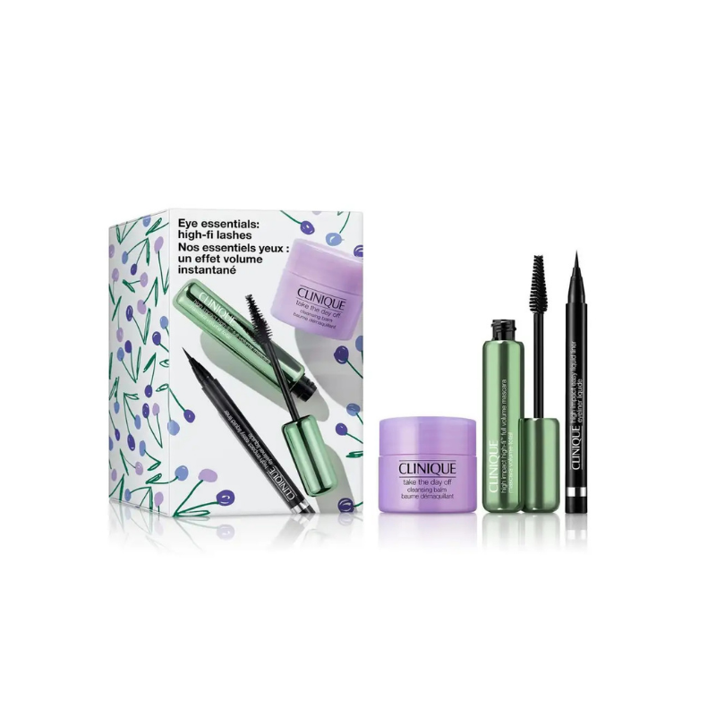 Il Clinique Eye Essentials High-Fi Lashes Set è un cofanetto pensato per offrire tutto il necessario per valorizzare lo sguardo in un unico kit. Include tre prodotti chiave: High Impact Easy Liquid Liner (0,34 g) – eyeliner liquido con punta di precisione, per linee nette senza difficoltà. High Impact High-Fi Mascara (10 g) – formula gel con fibre integrate che promette +230% di volume alle ciglia. Take The Day Off Cleansing Balm (formato da viaggio / 15 ml) – balsamo struccante che si trasforma in olio setoso per sciogliere trucco e impurità. Tutti i prodotti sono testati contro le allergie e 100% privi di profumo. Modalità d’uso suggerita: Tracciare la linea con l’eyeliner partendo dalla punta stretta per un tratto fine o impugnando in orizzontale per un tratto più marcato. Applicare il mascara dalle radici fino alle punte per massimizzare il volume. Alla sera, usare il balsamo struccante per rimuovere trucco, incluso waterproof e protezioni solari, con massaggi delicati, poi risciacquare.