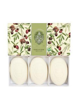 3 Saponi solidi scolpiti all'Olivo in Fiore, con burro di Karitè e Olio d'Oliva.