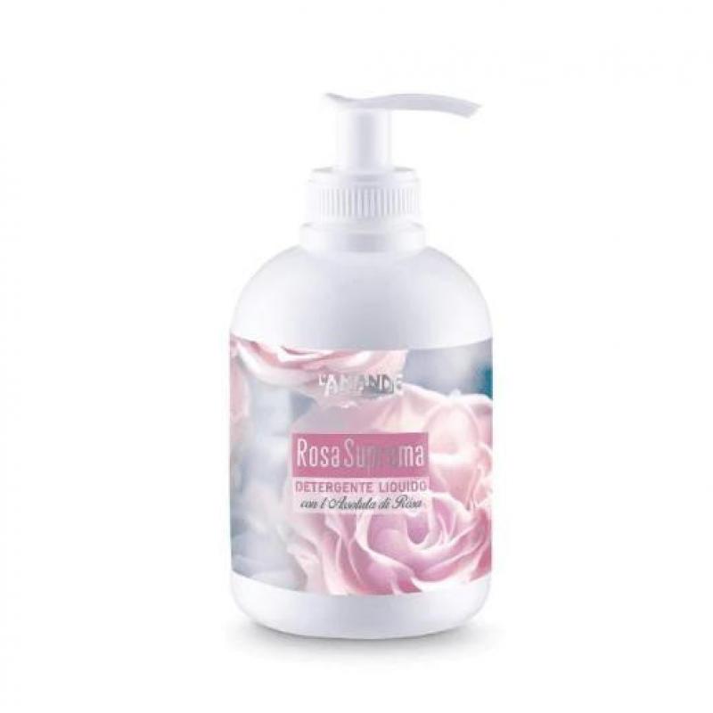 Il Detergente Liquido delicato Rosa Suprema L’Amande deterge le mani idratandole grazie alla glicerina vegetale che aiuta a mantenerle morbide e vellutate. Contiene l’Assoluta della Rosa di Grasse dal raffinatissimo profumo armoniosamente inserito in un bouquet completato dalle note fiorite del gelsomino, della mimosa e del geranio. Rosa Suprema è la Linea L’Amande che ha nell’Assoluta della rosa di Grasse il suo vero ed intimo cuore profumato. Molto più concentrata e duratura dell’olio essenziale, l’assoluta è anche l’essenza più autentica e raffinata del fiore simbolo stesso dell’alta profumeria. Completano la composizione le note fiorite del gelsomino, della mimosa e del geranio abbinate con cura e passione al preziosissimo pepe nero, al bergamotto di Calabria, al muschio bianco ed ai legni di sandalo e di cedro. Cosmetici d’alta gamma per pelli sensibili e delicate.