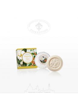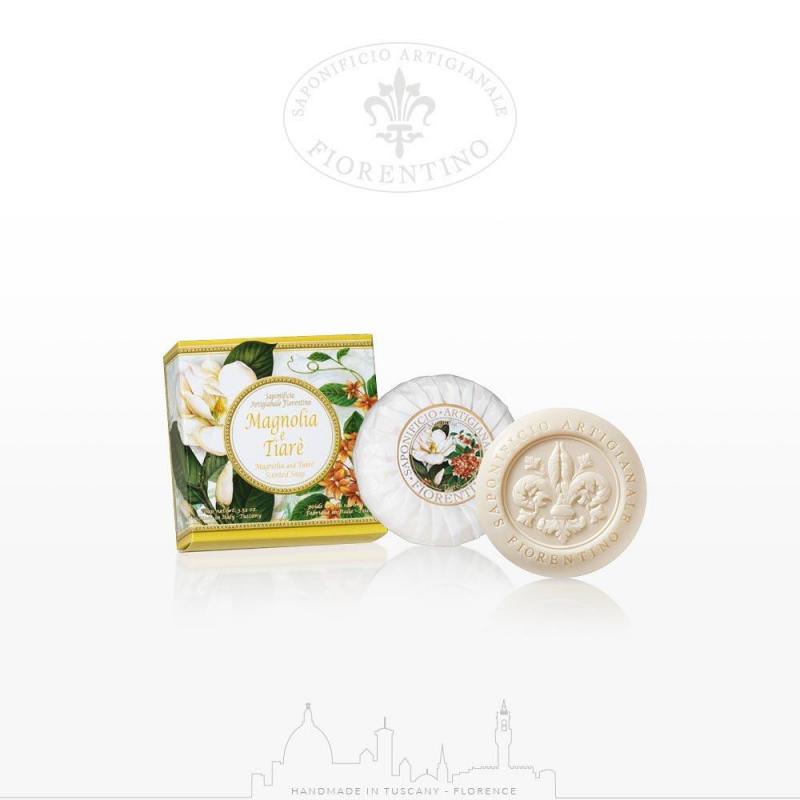 Sapone artigianale alla Magnolia e Tiarè 100% vegetale. Due fiori candidi e bellissimi, la magnolia e il tiarè. I loro profumi si uniscono per dare vita ad una fragranza delicata e sofisticata che saprà accompagnare le tue giornate donandoti un senso di freschezza sulla pelle. Avvolto in un elegante incarto plissè questo sapone di alta qualità è scolpito con il giglio fiorentino simbolo di arte e bellezza.