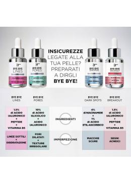 Bye Bye Dark Spots è un dermo-siero concentrato, clinicamente testato per agire su macchie e discromie. È formulato con il 4% di niacinamide e l’1% di acido etil-ascorbico (derivato della vitamina C) per ridurre visibilmente l’aspetto di macchi cutanee e discromie mentre agisce sulla luminosità e l’uniformità dell’incarnato. È adatto a tutti i tipi di pelle per ottenere un incarnato dall’aspetto più sano e uniforme. Ideale sia per le macchie da acne che per le macchie scure dell’eta e tutti gli altri tipi di discromie cutanee. Preparati a dire BYE BYE alle macchie, la tua soluzione per un incarnato uniforme è qui!