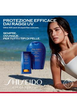 Lozione invisibile e leggera per viso e corpo che offre una protezione efficace dai raggi UVA e UVB. È dotata della NUOVA Tecnologia SynchroShieldRepair™*, il cui velo protettivo si rafforza con l'esposizione al calore, all'acqua e al sudore e si autoripara quando viene danneggiato lievemente da movimenti o sfregamenti. Assicurarsi di riapplicare frequentemente e generosamente prima e durante l'esposizione al sole, poiché nessun prodotto solare può garantire una protezione totale e continua dai raggi solari. Ricordarsi di adottare abitudini responsabili di esposizione al sole, come indicato nella sezione Modalità d'uso. *La NUOVA tecnologia SynchroShieldRepair™ è progettata per adattarsi ai fattori ambientali che potrebbero comprometterne l'efficacia (test in vitro). Scegli il meglio del trattamento solare Shiseido con Shiseido Sun Expert Protector Lotion SPF50+. Questa lozione sensoriale SPF50+ è arricchita con il 66% di ingredienti skincare per una pelle levigata e compatta, e offre un'elevata protezione UVA/UVB. Protezione solare formulata con il 66% di ingredienti skincare: - Complesso di alghe marine combinato con derivati dell'acido glicirrizico: aiuta a lenire la pelle secca e irritata e fornisce idratazione. - Profense CEL: aiuta a proteggere la pelle dai danni fotoindotti e a prevenire rughe e macchie scure - Safflower Extract: aiuta a rafforzare la compattezza e la densità della pelle per un effetto anti-età*. - Complesso Hypotaurine + NatureSurge: aiuta a combattere i danni causati da inquinanti atmosferici*. *Test in vitro Flacone in plastica al 70% di origine vegetale (senza tappo e dispenser)