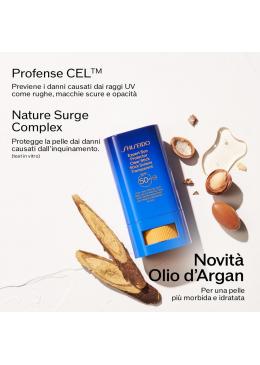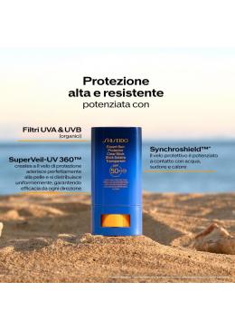 Stick invisibile e pratico, da portare sempre con sè, offre una protezione efficace dai raggi UVA e UVB. È dotato della tecnologia SynchroShield™*, il cui velo protettivo si rafforza con l'esposizione a calore, acqua e sudore. Assicurarsi di riapplicare frequentemente e generosamente prima e durante l'esposizione al sole, poiché nessun prodotto solare può garantire una protezione totale e continua dai raggi solari. Ricordarsi di adottare abitudini responsabili di esposizione al sole, come indicato nella sezione Come si usa. *La tecnologia SynchroShield™ è progettata per adattarsi a fattori ambientali che potrebbero comprometterne l'efficacia (test in vitro). Scegli il meglio del trattamento solare Shiseido con Expert Sun Protector Clear Stick SPF 50+. Questa protezione solare in stick, pratica da usare tutto l'anno, si applica senza appesantire o ungere. Il suo finish trasparente e l'effetto leggero lo rendono comodo da usare sempre, ovunque e per qualsiasi tipo di pelle, rendendolo l'alleato on-the-go per proteggersi dal sole. Protezione solare formulata con il 65% di ingredienti skincare: - Olio di Argan: rinomato per le sue proprietà protettive e nutrienti, per una pelle più morbida e idratata. - Profense CL: aiuta a proteggere la pelle dai danni fotoindotti e a prevenire rughe e macchie scure - NatureSurgeComplex: aiuta a combattere i danni causati dagli inquinanti atmosferici*. *test in vitro