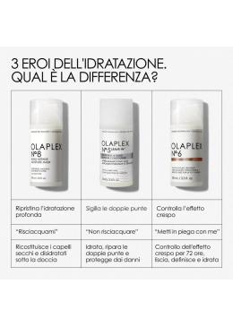 Questo idratante senza risciacquo fornisce risultati immediati e un effetto di riparazione e protezione dalla corteccia alla cuticola che dura nel tempo. Nº.5 LEAVE-IN ripara all’istante le doppie punte e rende il capello visibilmente più sano a ogni applicazione. Un’idratazione senza pari con OLAPLEX Bond Building Technology e il Complesso di riparazione ad alta adesione. Idrata, ammorbidisce e districa all’istante. Ripara subito le doppie punte. Ripara e protegge nel tem