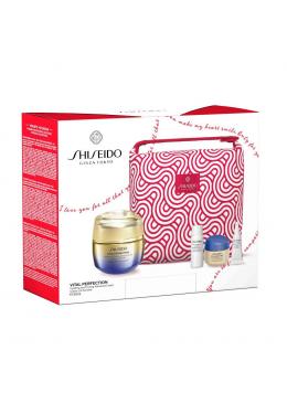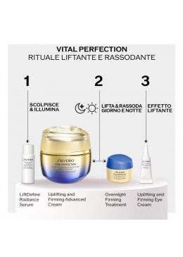 Il set contiene: VITAL PERFECTION Uplifting & Firming Advanced Cream 50 ml Una crema anti-età di Shiseido, per una pelle dall’aspetto più liftato, rassodato e luminoso. VITAL PERFECTION LiftDefine Radiance Serum 7ml Un siero concentrato per una pelle più compatta e definita, da utilizzare su viso e collo. VITAL PERFECTION Overnight Firming Treatment 15 ml Questa crema notte ricca e intensiva rassoda e rivitalizza la pelle durante la notte. Al risveglio, rughe ed elasticità risultano migliorate, l’incarnato più uniforme VITAL PERFECTION Uplifting & Firming Eye Cream 3 ml Una crema nutriente che contrasta le cause e i segni dell’affaticamento legati all’età, come rughe, occhiaie e borse sotto gli occhi. La scatola esterna è fatta di carta per sostenere la silvicoltura responsabile (FSC®). Il nostro impegno per la riduzione dell'impatto ambientale ha guidato la creazione di questo pochette.